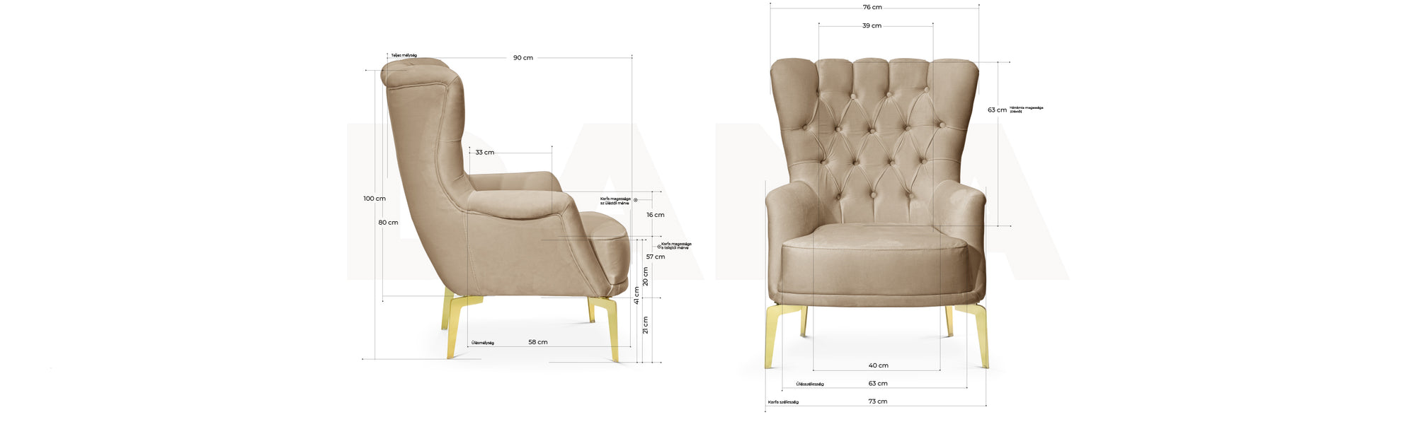A Dana egy modern, Chesterfield stílusú design fotel. A Dana bútorcsalád tagja, ideális választás a Dana kanpé mellé, mellyel akár azonos, vagy más kárpittal is színesítheted az otthonod, vagy irodád pihenő sarkát. A Dana fotel minden részlete aprólékosan, kézzel készített, mint a gombozott díszítéssel ellátott háttámla, ami jellegzetessége a Chesterfield stílusnak.
